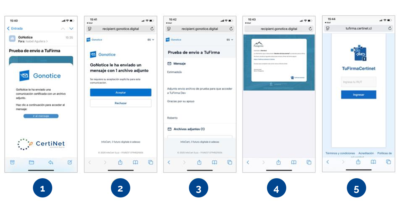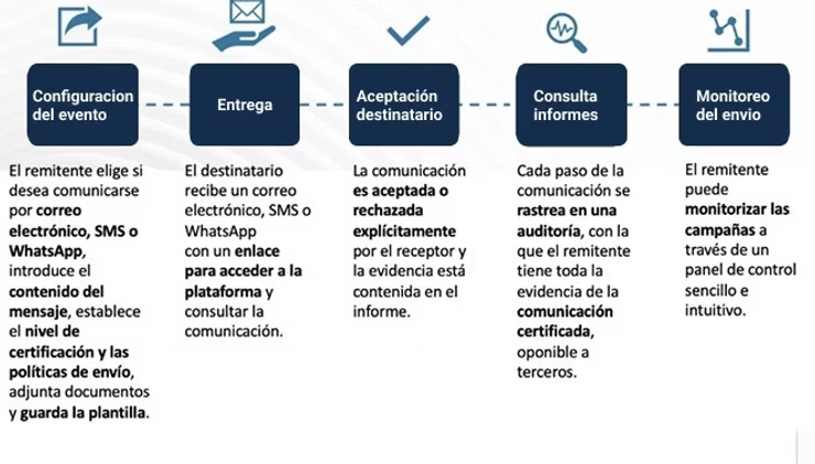 El sistema mantiene un registro detallado de envío, acceso, autenticación y acciones del destinatario. Cada evento queda respaldado por informes firmados digitalmente.
