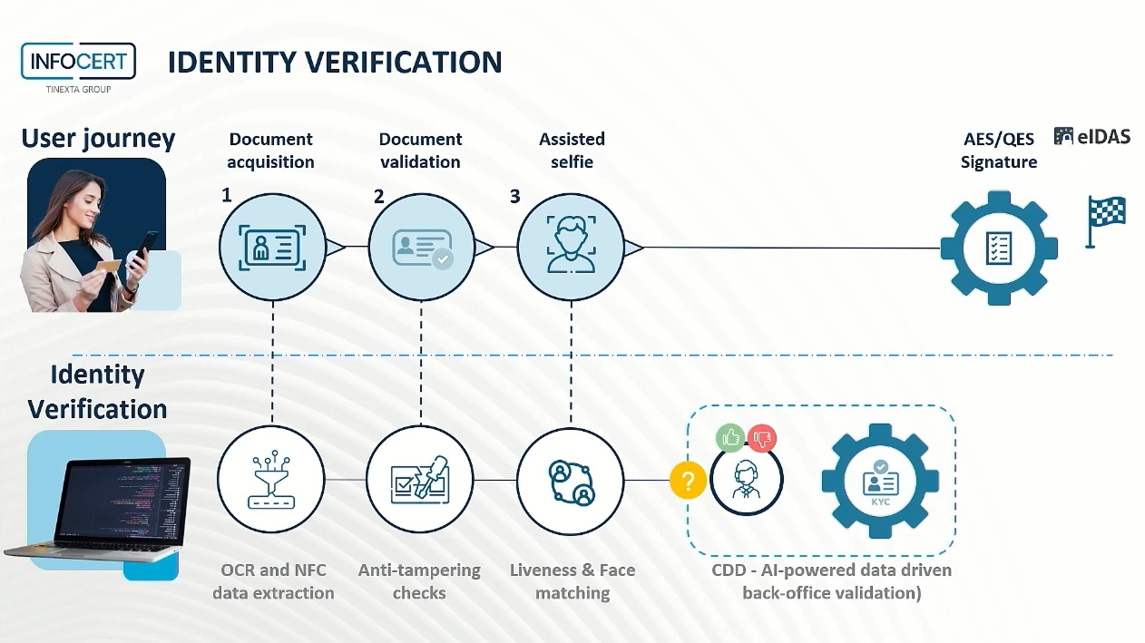 En el caso que existan dudas, por ejemplo la cámara no sea de buena calidad, se pasa a un proceso de identificación asistido por un operador de CertiNet que complementa la identificación por medio de un procedimiento equivalente al que usa InfoCert para proveer firma Cualificada en la Unión Europea.