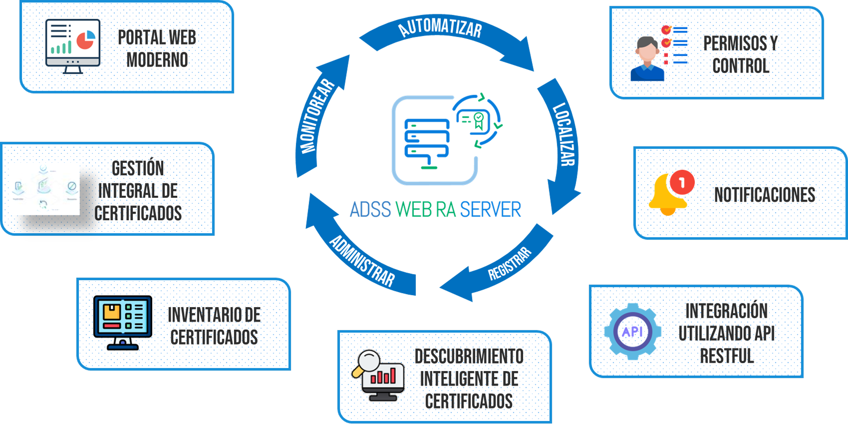 Web RA gestiona el ciclo de vida completo de todo tipo de certificados digitales, desde el registro, la verificación y la inscripción de dispositivos, aplicaciones y usuarios nuevos o actualizados, así como la revocación cuando ya no son necesarios o válidos